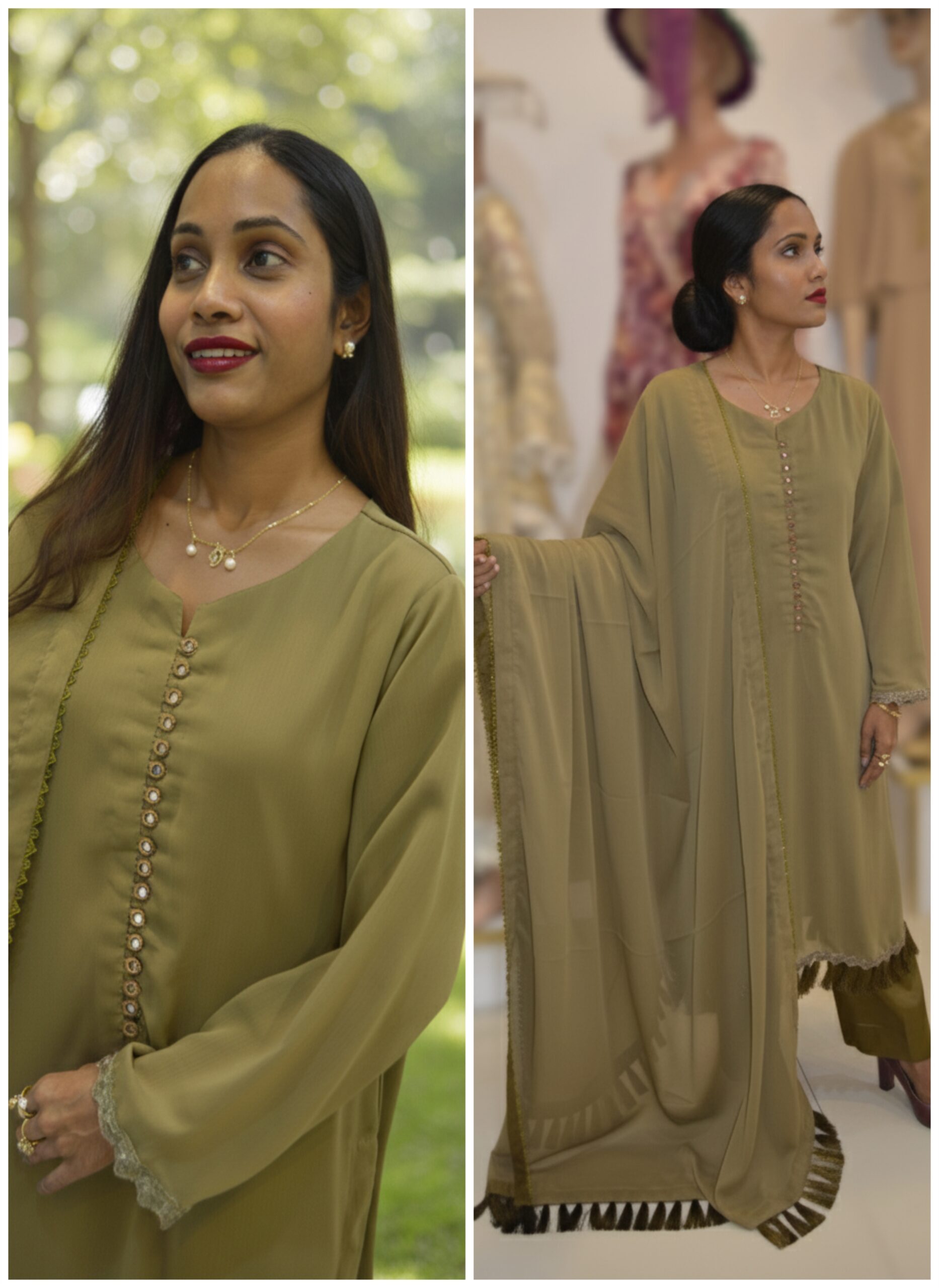 “Timeless Beauty in Mehndi Tone.”