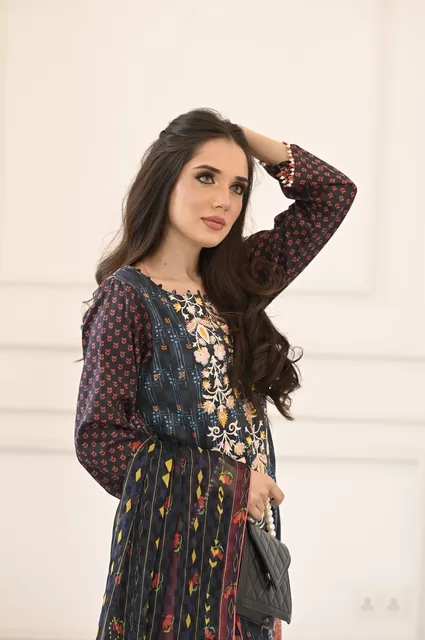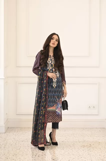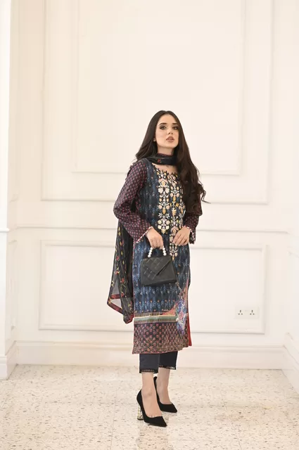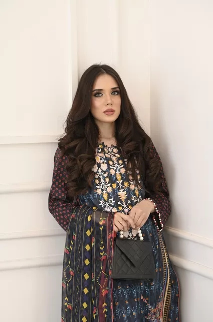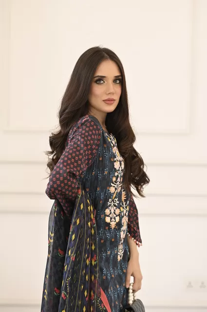 Embrace the summer season with an exquisitely Embroidered lawn Shirt, coupled with a chiffon dupatta and vibrant a navy blue color lawn trouser to make you stand out.